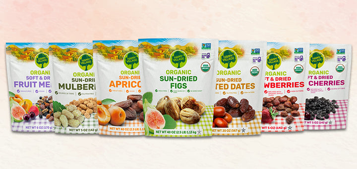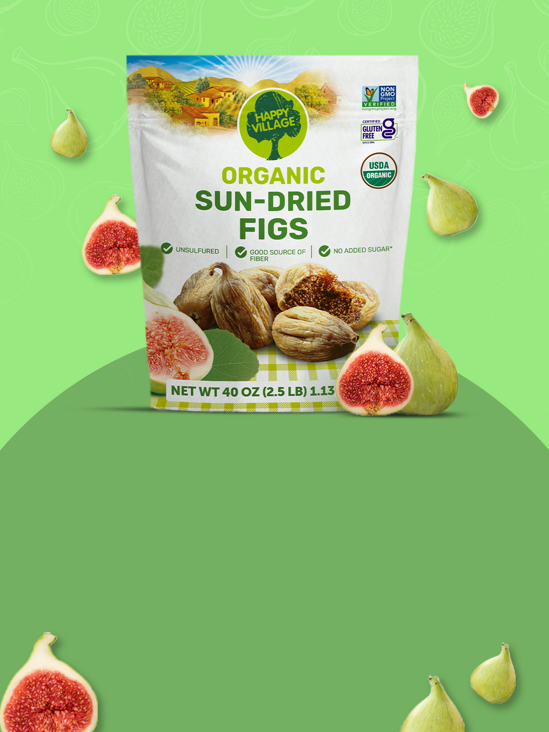- Organic sun-dried figs: Includes 40 oz resealable bag of Happy Village organic sun-dried figs. No added sugar, no preservatives.