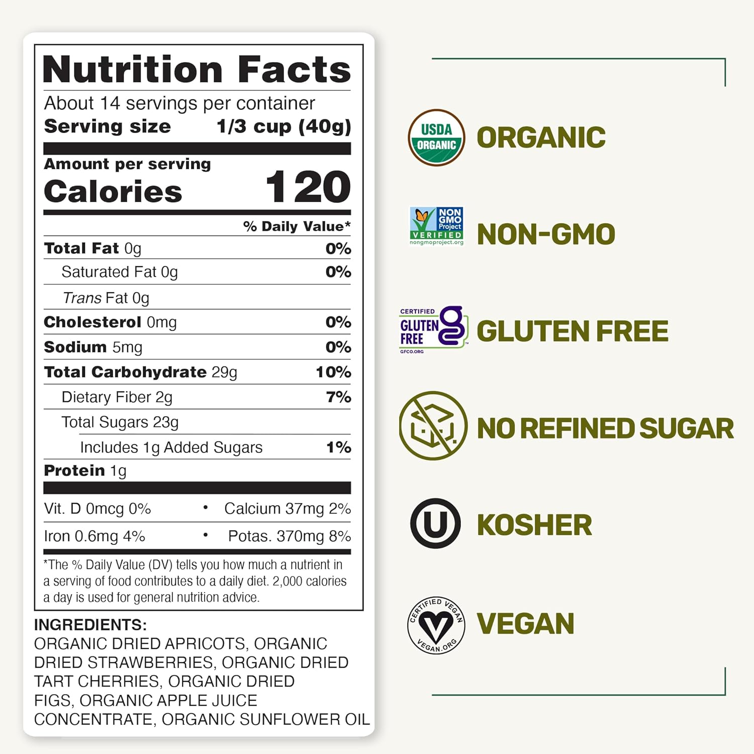 - PREMIUM ORGANIC MIX FRUIT : Our certified organic fruit medley is unsulfured and non-GMO certified. It is also Gluten-Free, Kosher, Raw and Vegan certified. Whatever your diet is, this antioxidant powerhouse will suit your needs.