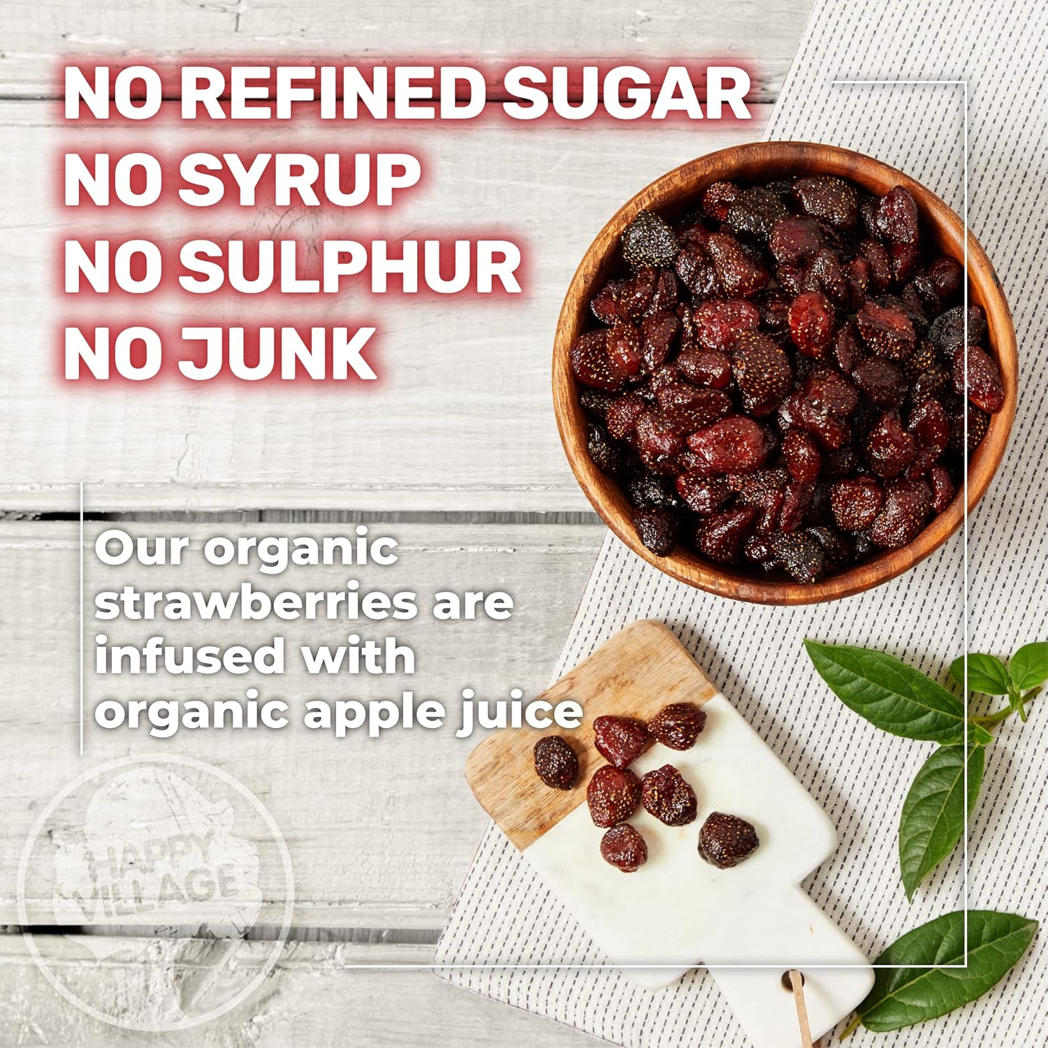 - Organic soft dried strawberries: Includes 18 oz resealable bag of Happy Village Organic gently dried strawberries. No refined sugar, no preservatives.